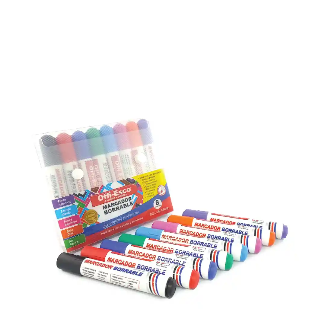 Marcador Borrable Para Tablero Offi-Esco, Caja X 8 Colores. Somos Bocetos Papelería. Empresa Santandereana, ubicados en Bucaramanga, con más de 40 años en el mercado, orgullosos de ser distinguidos en el ámbito comercial, por cumplir a cabalidad nuestra mayor política: brindar siempre y en todo momento una experiencia de satisfacción total a las necesidades de nuestros clientes. MARC OFFI-ESCO es un conjunto de 8 marcadores borrables surtidos. Estos marcadores están diseñados específicamente para su uso en pizarras blancas, pizarras de borrado en seco y otras superficies no porosas. Cada conjunto incluye 8 marcadores de colores surtidos, lo que significa que recibirás una variedad de colores en el paquete. Los colores comunes que se encuentran en estos conjuntos suelen ser negro, azul, rojo, verde y otros tonos vibrantes que pueden variar según el fabricante. La característica principal de estos marcadores es que son borrables, lo que significa que se pueden borrar fácilmente de la superficie sin dejar residuos ni manchas. Esto los convierte en una opción conveniente y práctica para cualquier entorno de enseñanza, oficina o reunión donde se utilicen pizarras blancas. Los marcadores suelen tener una punta fina que permite una escritura clara y precisa. También suelen tener una tapa de cierre para evitar que se seque la tinta cuando no se están utilizando.
