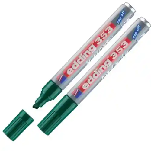 herramienta versátil y de alta calidad, ideal para oficinas, escuelas, talleres o el hogar. Diseñado especialmente para escribir sobre superficies no porosas como pizarras blancas, esmalte, vidrio o melamina, su tinta se borra fácilmente en seco, dejando siempre un trazo limpio y sin residuos. Características principales: Tipo de punta: Biselada Grosor de trazo: 1 a 5 mm Tinta: Casi inodora, sin adición de butilacetato Secado rápido y resistente a la luz Rellenable, con puntas de recambio disponibles Sistema antirrodadura que evita que ruede en superficies inclinadas Capuchón reposicionable, que puede colocarse en el extremo del marcador para evitar pérdidas Tecnología “cap off”, que permite dejarlo destapado durante varios días sin que se seque Uso y ventajas: Este marcador es perfecto para pizarras blancas, tableros de planificación, superficies esmaltadas o melaminadas, ofreciendo líneas precisas y un borrado sin esfuerzo. Su tinta recargable lo convierte en una opción ecológica y económica, ideal para un uso continuo. Además, su poco olor y secado rápido garantizan una experiencia cómoda y profesional. Descripción visual: El marcador Edding 353 tiene un diseño robusto y ergonómico, con cuerpo cilíndrico y tapa de color que indica el tono de la tinta. Su punta biselada permite realizar trazos finos o anchos con facilidad, adaptándose a distintas necesidades de escritura o presentación.