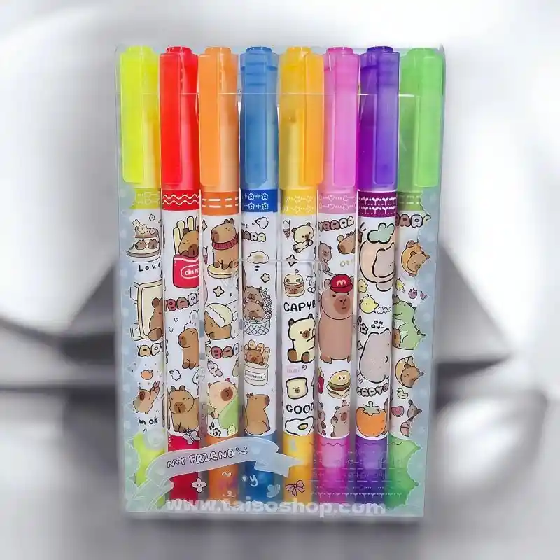 Doble diversión en un solo marcador: Punta escolar: Para escribir y resaltar con colores vibrantes. Punta rodillo con figuras: ¡Decora con estampados únicos con varios diseños! Perfecto para marcos, carátulas y detalles creativos. Con adorables diseños inspirados en capibaras, estos marcadores no solo son útiles, ¡sino que convertirán cada página en una obra de arte!