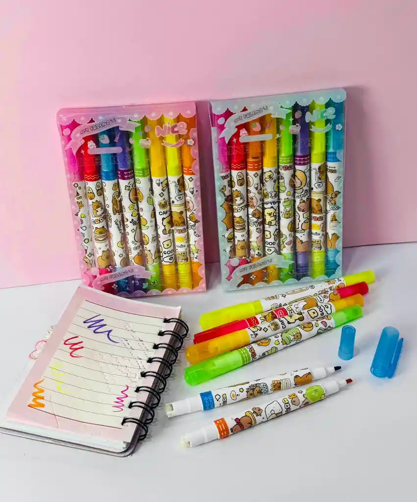Doble diversión en un solo marcador: Punta escolar: Para escribir y resaltar con colores vibrantes. Punta rodillo con figuras: ¡Decora con estampados únicos con varios diseños! Perfecto para marcos, carátulas y detalles creativos. Con adorables diseños inspirados en capibaras, estos marcadores no solo son útiles, ¡sino que convertirán cada página en una obra de arte!