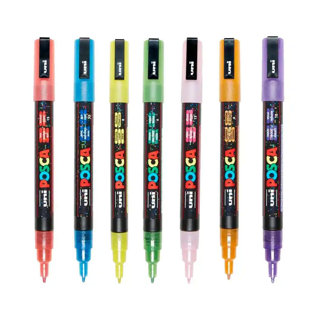 Marcador Gráfico De Vinilo Posca Metalizado Punta Pc-3m X 7 unidades. Somos Bocetos Papelería. Empresa Santandereana, ubicados en Bucaramanga, con más de 35 años en el mercado, orgullosos de ser distinguidos en el ámbito comercial, por cumplir a cabalidad nuestra mayor política: brindar siempre y en todo momento una experiencia de satisfacción total a las necesidades de nuestros clientes. Versátil, su punta cónica ofrece una libertad de uso ilimitada. ¡Ideal para cualquier creación! USO El Posca PC-3M punta media es el más versátil de la gama. Es una referencia apreciada tanto por los profesionales como por los aficionados por su trazo nítido y preciso que permite realizar coloreados impecables. USO PREVISTO El PC-3M es utilizado por múltiples y variados usuarios: los artistas y profesionales de la creación como arquitectos y agencias; los aficionados a las manualidades y la decoración de interiores; los surfistas y los skaters para personalizar sus tablas. Por su facilidad de uso, también es ideal para que los principiantes se atrevan a expresar su creatividad. Ideal para personalizar superficies porosas irregulares, como madera, piedra, vidrio, pared, graffiti PIGMENTOS INALTERABLES EN VINILO BASE AGUA ALTA RESISTENCIA UV SECADO RÁPIDO Permanente en superficies porosas y borrable en la mayoría de materiales lisos no porosos, se puede optimizar su fijación aplicando un barniz SUPERPONIBLE La pintura POSCA, densa y cubriente, es ideal para las superposiciones. Los colores oscuros se pueden aplicar sobre colores claros y viceversa. Y, gracias a su secado rápido, se pueden realizar fácilmente superposiciones sin rebosaduras.