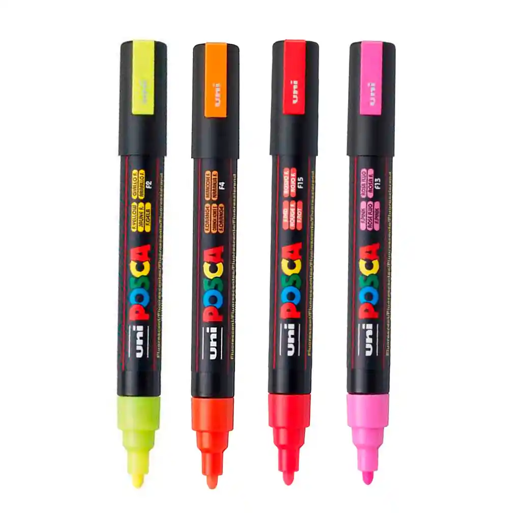 Marcador Gráfico De Vinilo Posca Fluorescente punta Pc-5m X4 Somos Bocetos Papelería. Empresa Santandereana, ubicados en Bucaramanga, con más de 35 años en el mercado, orgullosos de ser distinguidos en el ámbito comercial, por cumplir a cabalidad nuestra mayor política: brindar siempre y en todo momento una experiencia de satisfacción total a las necesidades de nuestros clientes. Versátil, su punta cónica ofrece una libertad de uso ilimitada. ¡Ideal para cualquier creación! USO El Posca PC-5M punta media es el más versátil de la gama. Es una referencia apreciada tanto por los profesionales como por los aficionados por su trazo nítido y preciso que permite realizar coloreados impecables. USO PREVISTO El PC-5M es utilizado por múltiples y variados usuarios: los artistas y profesionales de la creación como arquitectos y agencias; los aficionados a las manualidades y la decoración de interiores; los surfistas y los skaters para personalizar sus tablas. Por su facilidad de uso, también es ideal para que los principiantes se atrevan a expresar su creatividad. Ideal para personalizar superficies porosas irregulares, como madera, piedra, vidrio, pared, graffiti PIGMENTOS INALTERABLES EN VINILO BASE AGUA ALTA RESISTENCIA UV SECADO RÁPIDO Permanente en superficies porosas y borrable en la mayoría de materiales lisos no porosos, se puede optimizar su fijación aplicando un barniz SUPERPONIBLE La pintura POSCA, densa y cubriente, es ideal para las superposiciones. Los colores oscuros se pueden aplicar sobre colores claros y viceversa. Y, gracias a su secado rápido, se pueden realizar fácilmente superposiciones sin rebosaduras.