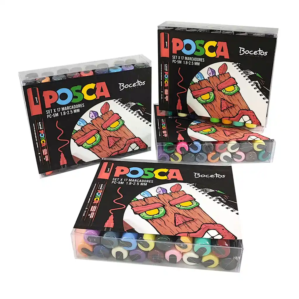 Marcador gráfico posca pc-5m set x 17 colores punta fina Trazo entre 1.8 - 2.5 mm El Posca PC-5M punta media es el más versátil de la gama. Es una referencia apreciada tanto por los profesionales como por los aficionados por su trazo nítido y preciso que permite realizar coloreados impecables. USO PREVISTO El PC-5M es utilizado por múltiples y variados usuarios: los artistas y profesionales de la creación como arquitectos y agencias los aficionados a las manualidades y la decoración de interiores los surfistas y los skaters para personalizar sus tablas. Por su facilidad de uso, también es ideal para que los principiantes se atrevan a expresar su creatividad. Ideal para personalizar superficies porosas irregulares, como madera, piedra, vidrio, pared, graffiti PIGMENTOS INALTERABLES EN VINILO BASE AGUA ALTA RESISTENCIA UV SECADO RÁPIDO Permanente en superficies porosas y borrable en la mayoría de materiales lisos no porosos, se puede optimizar su fijación aplicando un barniz SUPERPONIBLE La pintura POSCA, densa y cubriente, es ideal para las superposiciones. Los colores oscuros se pueden aplicar sobre colores claros y viceversa. Y, gracias a su secado rápido, se pueden realizar fácilmente superposiciones sin rebosaduras.