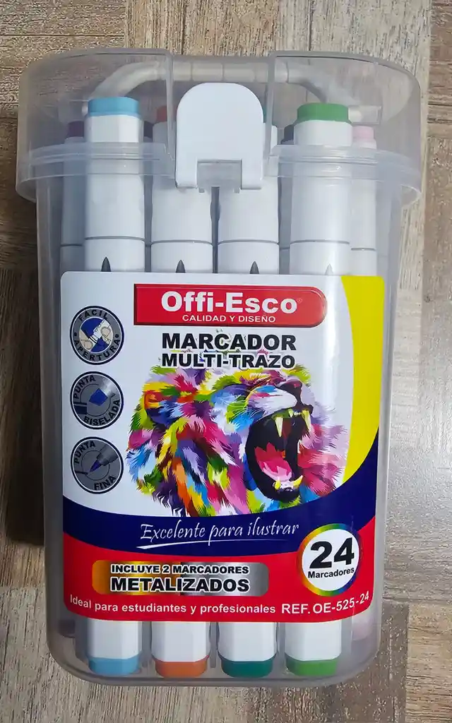 MARCADOR MULTITRAZO 24/U Incluye 2 MARCADORES METALIZADOS OFFI-ESCO TINTA PERMANENTE A BASE DE ALCOHOL COLORES INTENSOS Y BRILLANTES IDEAL PARA ESTUDIANTES Y PROFESIONALES PRACTICO MARCADOR DOBLE PUNTA PARA ILUSTRACIONES PUNTA DELGADA Y GRUESA