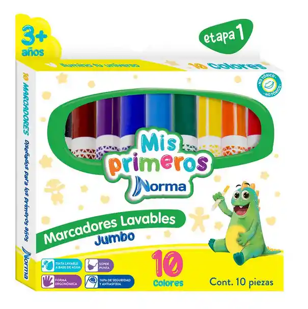 MARCADOR NORMA LAVABLE JUMBO GIGANTE CAJA X10 MIS PRIMEROS NORMA Ideales para las primeras experiencias creativas de los niños. Estos marcadores jumbo cuentan con puntas gruesas y resistentes, perfectas para trazos firmes y fáciles, favoreciendo el agarre en manos pequeñas. Su tinta es lavable a base de agua y no tóxica, brindando seguridad y tranquilidad al momento de colorear. Incluye 10 colores brillantes que inspiran la imaginación y facilitan el aprendizaje creativo. Además, su diseño ergonómico y su tapa antisofoco los hacen una opción segura, cómoda y divertida para los más pequeños de 3 años en adelante. ✨ Perfectos para: ✔ Jardín – Preescolar ✔ Actividades de arte y color ✔ Aprendizaje temprano y motricidad fina 🧼 Limpios, seguros y llenos de color 🎨 ¡La mejor opción para acompañar sus primeros trazos!