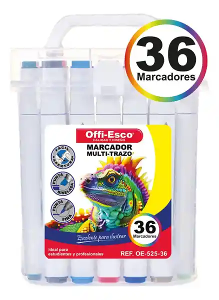 Marcador permanente multi-trazo. Punta biselada y punta fina Tinta permanente a base de alcohol Excelente para ilustrar Ideal para estudiantes y profesionales Estuche x 36 Unds.