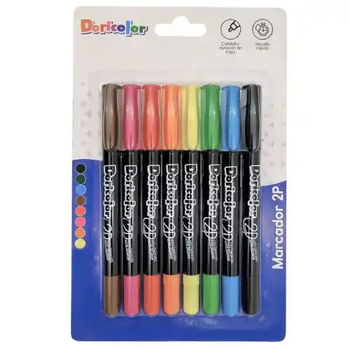 herramienta práctica y duradera ideal para uso escolar, artístico, profesional o doméstico. Su diseño innovador ofrece dos tipos de punta en un solo marcador: una fina de 0,7 mm para trazos precisos y una gruesa de 2,3 mm para líneas más amplias, brindando versatilidad en cada proyecto. Características: Presentación: Blíster con 8 marcadores de colores surtidos. Tipo de tinta: Permanente y de secado rápido. Doble punta: 0,7 mm (fina) y 2,3 mm (gruesa). Cuerpo ergonómico, cómodo y fácil de manejar. Colores intensos y duraderos, con tonalidad estable frente al paso del tiempo. Resistente al agua y al desgaste. Trazo permanente que no se desvanece. Usos recomendados: El Marcador Permanente 2P Doricolor es ideal para escribir, decorar o rotular sobre casi cualquier superficie: Lisas: metal, plástico, cerámica, vidrio. Porosas: cartón, madera, marmolina, papel. Además, es perfecto para marcar CD, carpetas, herramientas o materiales escolares. Descripción: Cada marcador combina funcionalidad y calidad en un solo diseño. Su doble punta permite adaptarse a distintas necesidades sin cambiar de marcador, mientras que sus colores vibrantes aportan un acabado profesional. El empaque tipo blíster facilita su almacenamiento y transporte. Un set indispensable para quienes buscan precisión, durabilidad y color en cada trazo.
