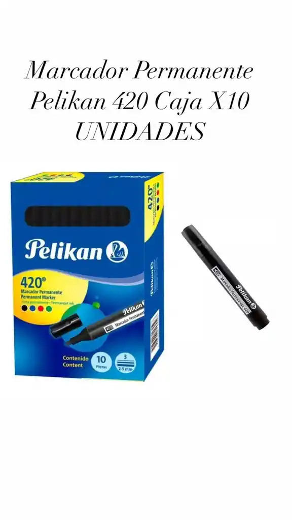 Marcador Permanente 420 Marcador permanente de cuerpo redondo que brinda un agarre preciso Rinde más de 450mts Disponible en 4 colores de tinta Presentaciones: Caja x 10 UNIDADES Colores: Azul Negro Rojo Verde Garantía Todos nuestros productos tienen 3 meses de garantía por defectos de fabricación. Tenemos envios con pago contraentrega en Bogotá, soacha, chia, usme pueblo, tiguaque, Engativa pueblo, calle 220, facatativa, rosal, zipaquira, tocancipa, cajica, mosquera, funza, Madrid, sopo, sibate, tengo, tabio, cota y calera. Despachamos a todo el pais No tòxico