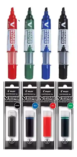 Set Marcadores Pilot Tablero Recargables + Tintas - Por esta compra recibe 4 marcadores Borrables Recargables + 4 tintas. - Colores: Azul, Negro, Rojo y Verde - Tinta Líquida - No remover el cartucho hasta que esté completamente vacío - Trazo Medio - Marcadores de punta biselada - Marca Pilot