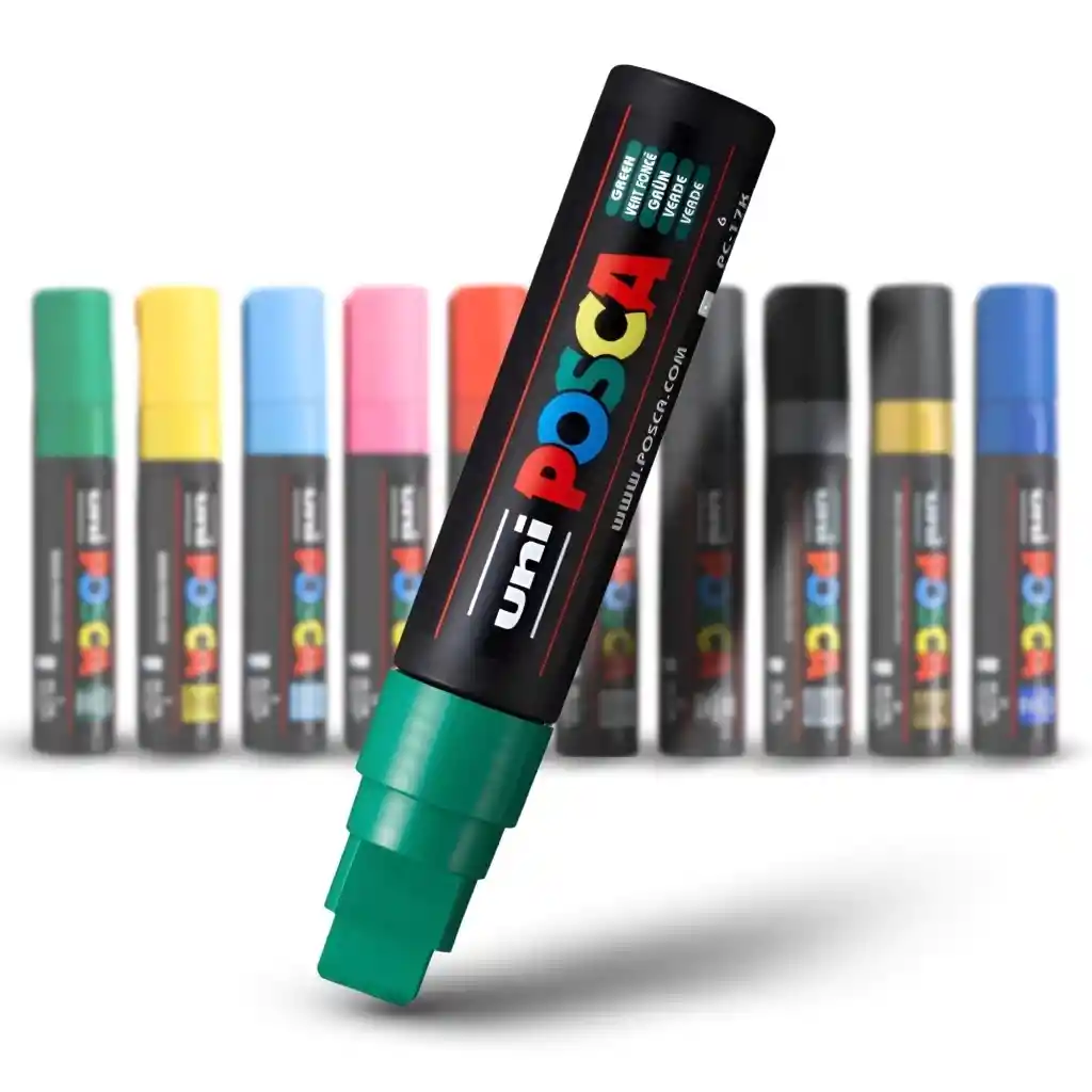 Marcador de vinilo, gráfico posca REF pc-17k, Trazo de 15.0 mm Color: Verde El PC-17k es utilizado por múltiples y variados usuarios: los artistas y profesionales de la creación como arquitectos y agencias; los aficionados a las manualidades y la decoración de interiores; los surfistas y los skaters para personalizar sus tablas. Por su facilidad de uso, también es ideal para que los principiantes se atrevan a expresar su creatividad. Ideal para personalizar superficies porosas irregulares, como madera, piedra, vidrio, pared, graffiti PIGMENTOS INALTERABLES EN VINILO BASE AGUA ALTA RESISTENCIA UV SECADO RÁPIDO Permanente en superficies porosas y borrable en la mayoría de materiales lisos no porosos, se puede optimizar su fijación aplicando un barniz SUPERPONIBLE La pintura POSCA, densa y cubriente, es ideal para las superposiciones. Los colores oscuros se pueden aplicar sobre colores claros y viceversa. Y, gracias a su secado rápido, se pueden realizar fácilmente superposiciones sin rebosaduras. Productos similares