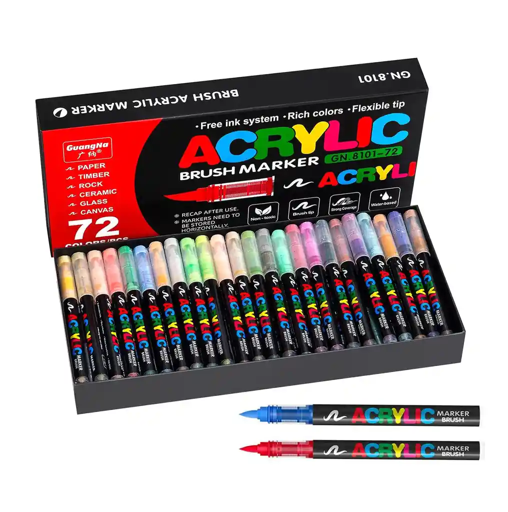 Juego de rotuladores de pintura acrílica de punta flexible, no tóxicos, multisuperficie, con base de agua, para lienzo, vidrio, madera, papel, cerámica. 72 Colores suaves y vibrantes que no traspasan el papel. Perfectos para diario, dibujar o colorear en la mayoría de tipos de papel. Las puntas de pincel flexibles permiten un control preciso tanto para líneas finas como para trazos más amplios, lo que permite una expresión artística detallada. Fuerte cobertura: los pigmentos premium proporcionan una excelente saturación de color y opacidad en superficies claras y oscuras
