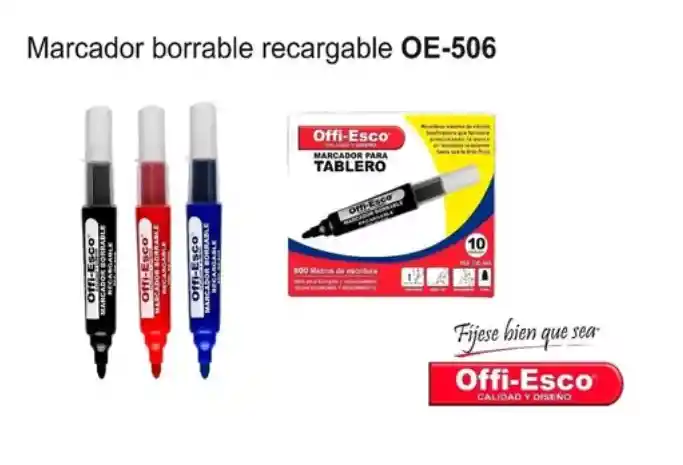Descripción DETALLES: • Referencia OE 506. • Marca Offi Esco. • Novedoso sistema de válvula. • Dosificadora que funciona presionando la punta en repetidas ocasiones. • 3 mm. • 10 unidades. • 800 Metros de escritura. * También Vendemos los Cartuchos de recarga. * Somos Distribuidores de la marca. * Entregas el mismo día (Bogota.)