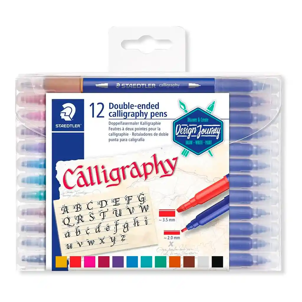 STAEDTLER Design Journey – Set de 12 Marcadores de Caligrafía de Doble Punta Explora el arte de la escritura con precisión y estilo. Este set de 12 marcadores de caligrafía STAEDTLER está diseñado para quienes buscan expresión artística en cada trazo, ya sea en proyectos creativos, tarjetas personalizadas o lettering profesional. Características clave: Doble punta versátil: una de 3.5 mm para trazos amplios y otra de 2.0 mm para detalles finos. Colores vivos y variados, desde tonos cálidos como rojo y naranja hasta fríos como azul y verde, ideales para composiciones dinámicas. Diseño ergonómico y presentación premium en estuche transparente, perfecto para organizar y transportar. Inspiración visual incluida: ejemplos de caligrafía en el empaque para estimular tu creatividad desde el primer uso. Ideal para artistas, diseñadores, aficionados al lettering y cualquier persona que quiera transformar palabras en obras de arte.