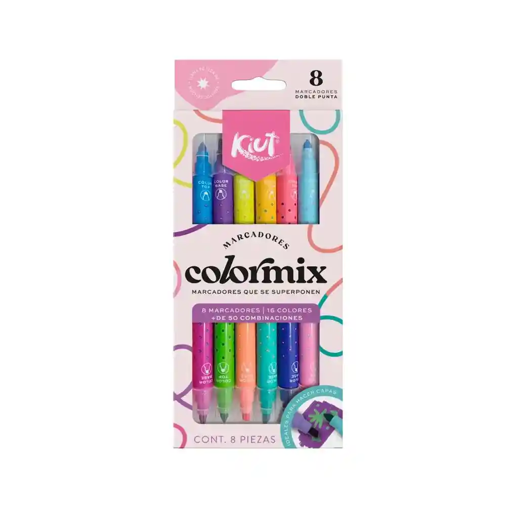 Marcadores color mix, marcadores que se superponen, esta cajita contiene: 8 marcadores doble punta, 16 colores y + de 50 combinaciones, por un lado son punta biselada y por el otro punta cónica. !Explora, superpone y sorprendete!