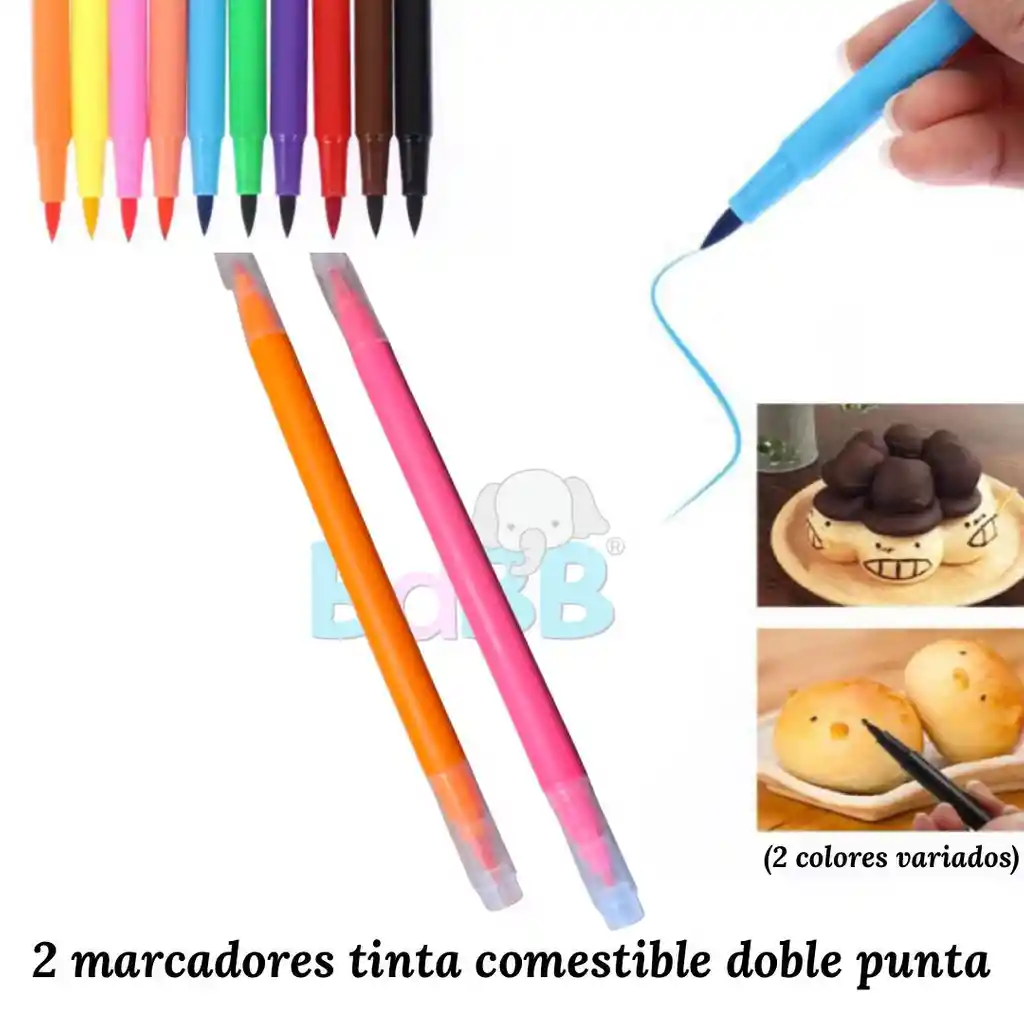 Acompaña las comidas/onces/loncheras de tu bebé con este set de 2 de marcadores con tinta comestible doble punta (una punta fina y otra gruesa), apto para marcar fruta, pan, galletas, foundant y comida que quieras decorar. Llegan 2 marcadores de diferente colores, todos variados, doble punta y doble tapa. Disfruta esta hermosa etapa de alimentarlos no solo saludablemente si no de una manera divertida y diferente.