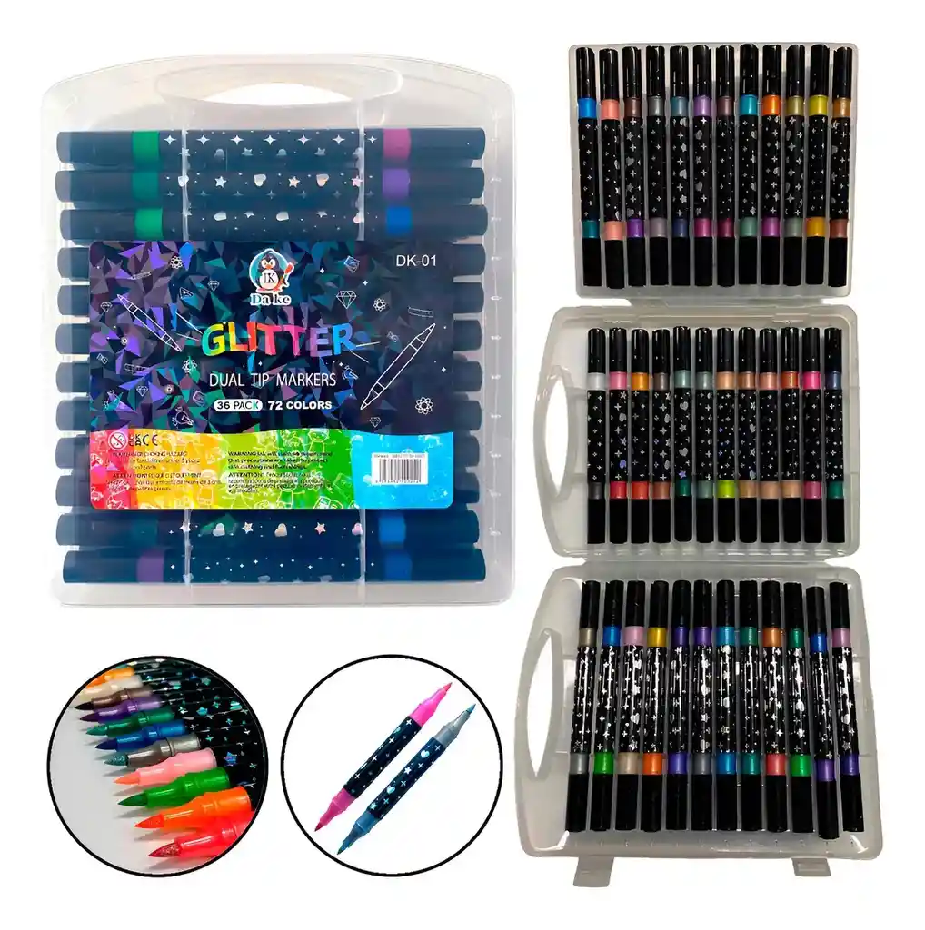 Dale un toque de brillo a tus creaciones con este completo kit de marcadores con brillo! Incluye 36 marcadores de doble punta con punta pincel, que ofrecen 72colores vibrantes con un acabado brillante, ideales para estimular la creatividad de niños y adultos. Perfectos para: colorear, crear dibujos brillantes, escribir mensajes creativos y decorar tarjetas con estilo. Cada marcador tiene una punta de doble pincel de 0,9 mm, que proporciona trazos de aproximadamente 2 mm, siempre suaves, uniformes y llenos de vida.