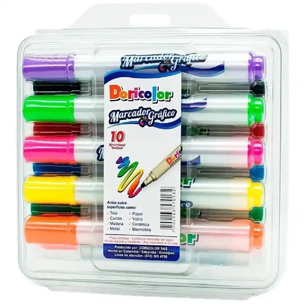 Estuche De Marcadores Gráfico Doricolor X 10 Unidades Descripción del producto: - Contenido: 10 marcadores surtidos - Colores: Rojo, verde, negro, azul, blanco, morado, rosado, amarillo, naranja y fucsia - Ideal para las siguientes superficies: Tela, cartón, madera, metal, papel, vidrio, cerámica y marmolina. - Marcador de trazo continuo, - Su tinta se puede remoer con agua - Punta redonda y resisntente - Ideal para marcar globos, prácticas de lettering entre otras técnicas creativas.