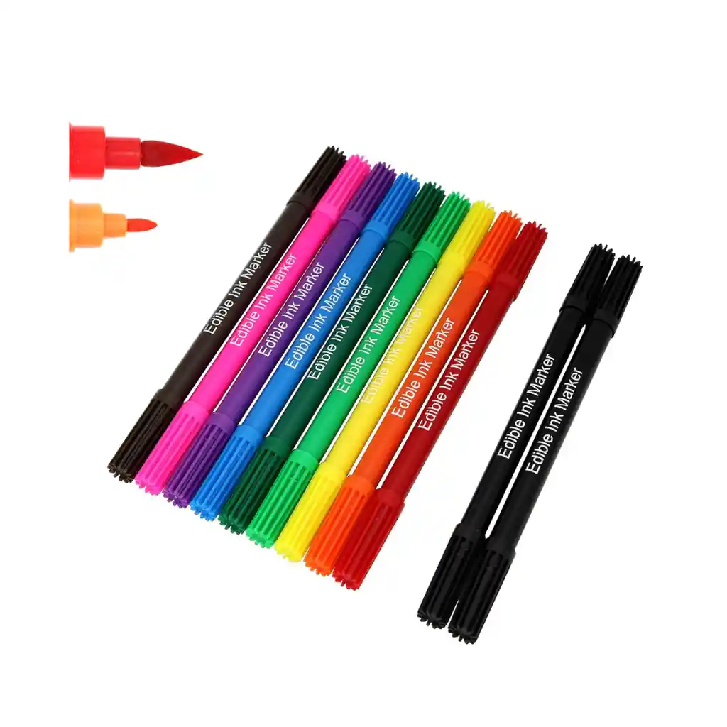 11 bolígrafos con 2 bolígrafos de color negro en el interior Puntas de doble punta. Punta ancha para colorear, fina para letras y contornos 100% seguro y comestible. Fabricado con tinta comestible Apto para niños. Fácil y divertido de usar, también perfecto para estarcido, estampado o creación de garabatos. Se utiliza en fondant, galletas, pasta de goma, glaseados, glaseado, pasteles, donas, petit fours, chocolate blanco, malvaviscos, frutas, verduras y mucho más