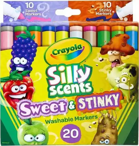 MARCADORES CRAYOLA SILLY SCENTS: Cuenta con 10 marcadores de olor dulce y 10 marcadores apestosos. AROMAS DULCES: Los niños pueden oler aromas dulces, como coco, uva y fresa. AROMAS STINKY: a los niños les encantarán los olores olorosos que incluyen champiñones, pizza, cebolla, papas sucias, dientes viejos podridos, frutas podridas, queso, ajo, pepinillos y humo. MARCADORES LAVABLES: estos marcadores perfumados de línea ancha se pueden lavar de la piel y de la mayoría de las prendas lavables. SEGURO Y NO TÓXICO: Suministros divertidos para colorear que son un excelente regalo para niños de 3 años en adelante. NOTA GENERAL: El empaque, contenido, olores y colores pueden variar. Recomendamos conservar el embalaje para referencia futura.