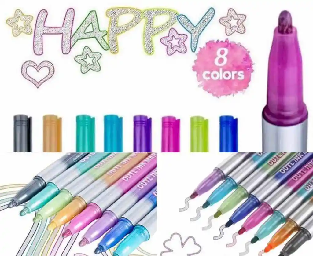 Estos espectaculares marcadores metalizados se pueden utilizar sobre cualquier superficie. Su trazo es metalizado en el interior y el borde lleva un tono diferente y delgado. El juego viene x 8 marcadores