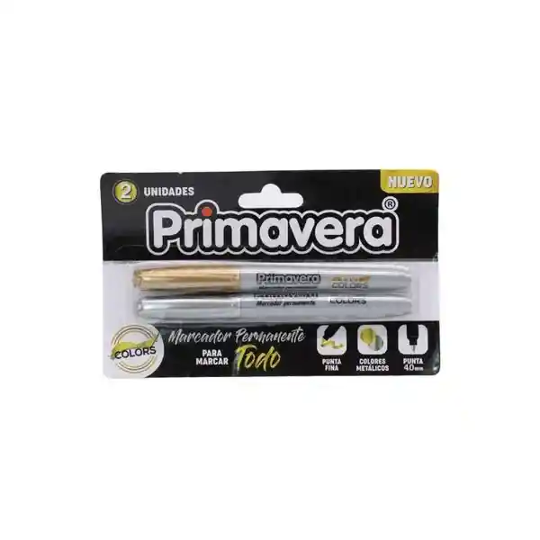 Marcadores Permanentes Metálicos Primavera – Set de 2 Unidades Dale un toque especial y brillante a tus proyectos con los marcadores permanentes metálicos de la marca Primavera. Este práctico set incluye 2 marcadores de colores metálicos, ideales para escribir, decorar y personalizar diferentes superficies. ✨ Características principales: Colores metálicos que resaltan sobre superficies claras y oscuras. Punta fina (4.0 mm) para trazos precisos y definidos. Tinta permanente, perfecta para marcar en múltiples materiales. Multiuso: funciona en papel, cartón, plástico, vidrio, metal y más. Presentación de 2 unidades, ideal para tener variedad en tus diseños. 🎨 Perfectos para manualidades, decoración, rotulación, tarjetas, proyectos escolares y DIY.