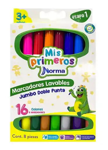 Diseñados especialmente para niños a partir de 3 años. 16 Colores Vibrantes: 8 marcadores con doble punta ofrecen 16 colores únicos para estimular la creatividad. Tinta Lavable a Base de Agua: Fácil de limpiar de la mayoría de las superficies, incluyendo la piel. Diseño Jumbo: Punta grande y ergonómica, ideal para el agarre de los más pequeños. Tapa de Seguridad Antiasfixia. No Tóxico