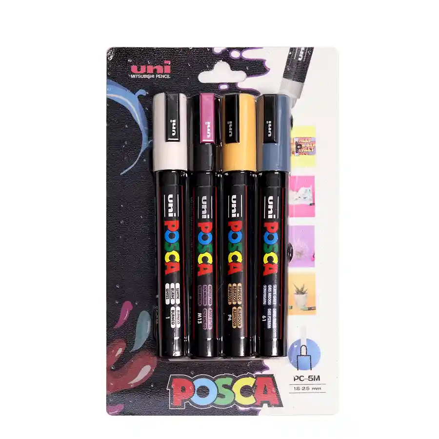 Colores: Blanco, Rosa Metalizado, Albaricoque y Gris Pizarra Posca PC-5m con 4 colores vibrantes. Perfectos para diversas superficies. Punta media Redonda 2,5mm PC-5m Trazo medio Se pueden utilizar en diferentes superficies: Pizarras, maderas, paredes, papeles, vidrios, textiles y más... ¡Crea y pinta sin límites!
