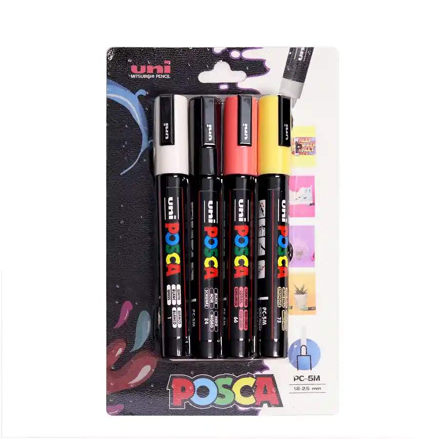 Colores: Blanco, Negro, Coral y Amarillo Posca PC-5m con 4 colores vibrantes. Perfectos para diversas superficies. Punta media Redonda 2,5mm PC-5m Trazo medio Se pueden utilizar en diferentes superficies: Pizarras, maderas, paredes, papeles, vidrios, textiles y más... ¡Crea y pinta sin límites!