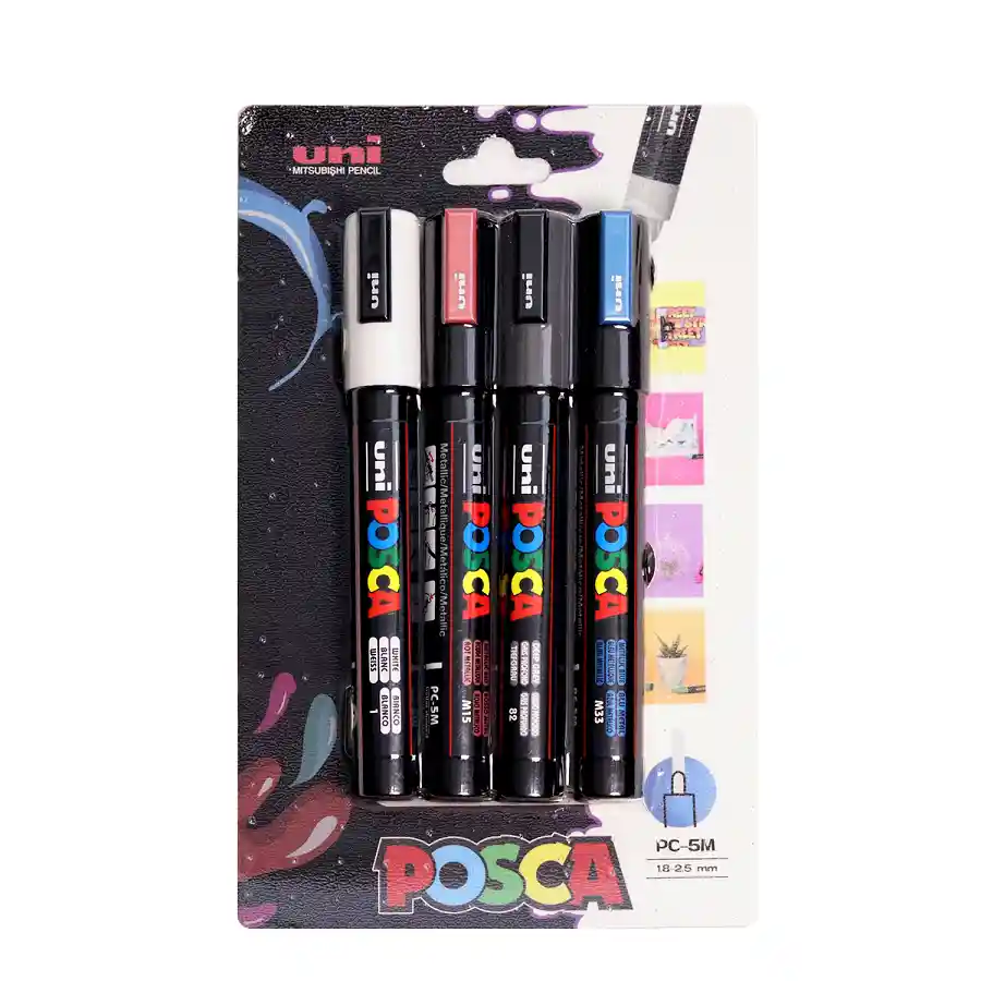 Colores: Blanco, Negro, Rojo Metalizado y Azúl Metalizado Posca PC-5m con 4 colores vibrantes. Perfectos para diversas superficies. Punta media Redonda 2,5mm PC-5m Trazo medio Se pueden utilizar en diferentes superficies: Pizarras, maderas, paredes, papeles, vidrios, textiles y más... ¡Crea y pinta sin límites!