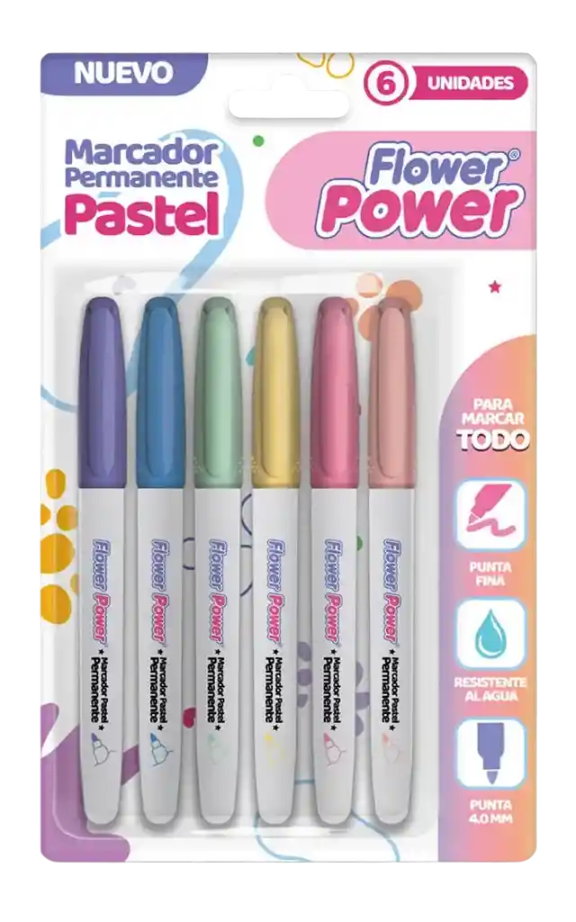 Marcadores Permanentes Flower Power Pastel x6 realizas hermosos trabajos de arte y decoración con una calidad insuperable, gracias a sus tintas no tóxicas, de rápido secado, alta durabilidad y con sus colores pasteles, puedes marcar TODO lo que se te ocurra en la mayoría de las superficies.Cuenta con una punta fina de 4 mm., cuerpo redondo y fácil agarre que te permitirán realizar trazos con mayor precisión y su presentación es de blister por 6 unidades.