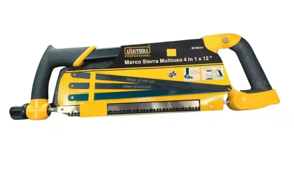 MARCO PROFESIONAL SIERRA MULTIUSOS 4 EN 1 X 12" UYUSTOOLS • Tubo cuadrado para mayor durabilidad. • Mango ergonómico con protección en goma. • Se puede montar la hoja a 45° - 90° - 135° y 180° • Incluye 4 hojas para cortar metales, plástico, madera seca, madera húmeda. • Altura: 14 CM. • Largo sierra: 300 mm. • Modelo: MCM401 • Color: Amarillo y negro. • Peso: 630 GR. • Marca UYUSTOOLS