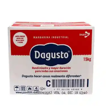 Margarina Dagusto Industrial Margarina con rendimiento, frescura y suavidad en todas las preparaciones de panificación. Las verdades de Dagusto IndustriaL ideal para todo tipo de preparaciones en la panificación. Alta incorporación y atrapado de aire = mayor volumen. Excelente sabor y aroma a mantequilla. Alta retención de humedad = mayor duración del producto terminado. Ahorro de tiempo, esfuerzo físico y equipos por su suave consistencia, más color a mantequilla. Presentación: Caja x 15 kilos