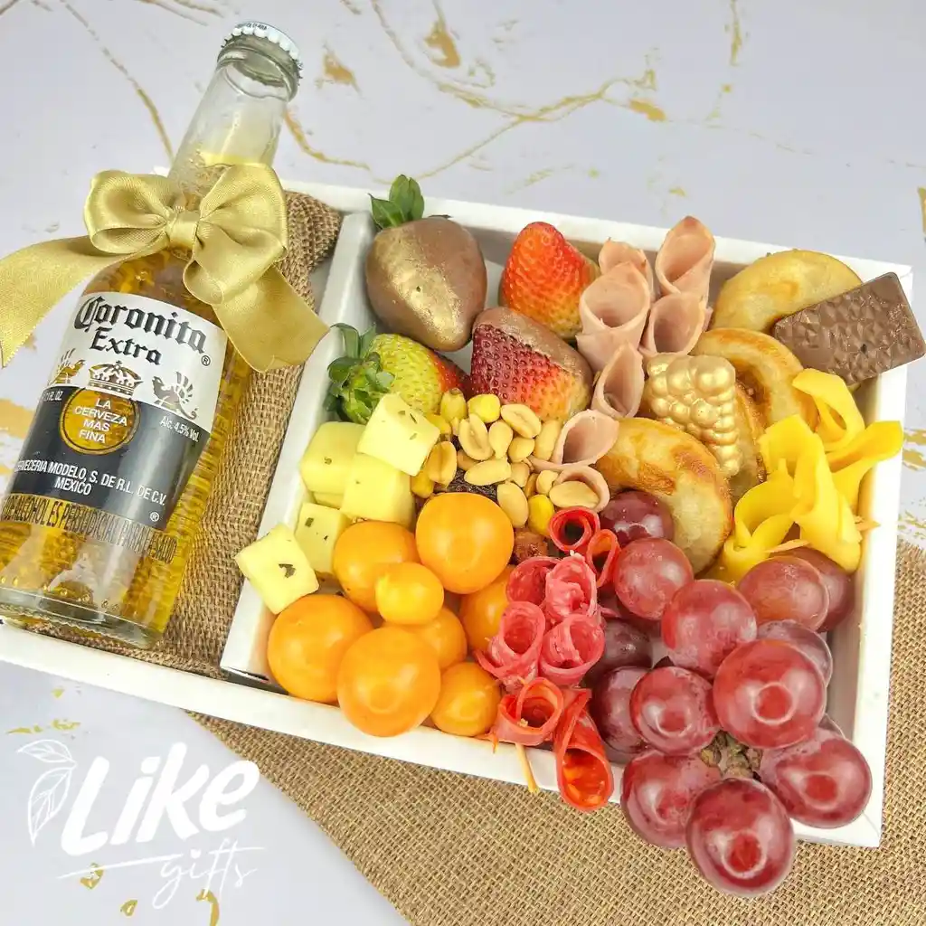 Descubre la armonía perfecta entre la refrescante Corona y un exquisito maridaje. Deléitate con la combinación de sabores de jamones seleccionados, quesos gourmet y jugosas frutas que realzan la experiencia cervecera. Además, agrega un toque dulce con mini donas y chocolates irresistibles. Celebra con este maravilloso conjunto de sabores. 1 Coronita Exquisita selección de quesos sabanero, mozzarella orégano acompañados de salami, chorizo vela, jamón ahumado, uvas, uchuvas, fresas con chocolate mini donas y barritas de chocolate.