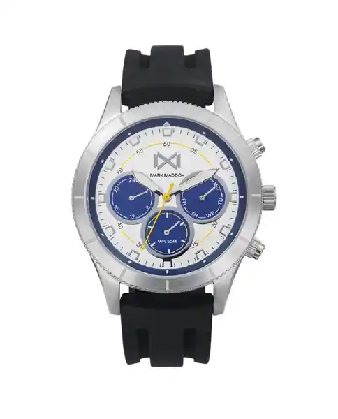 Género: Hombre Tamaño de la Caja: 45 mm Color Tablero: Blanco Material Mica: Cristal Mineral Color de la Caja: Plateado Material de la Caja: Acero Color Del Pulso: Negro Material Del Pulso: Silicona Resistencia al Agua: 50 Metros