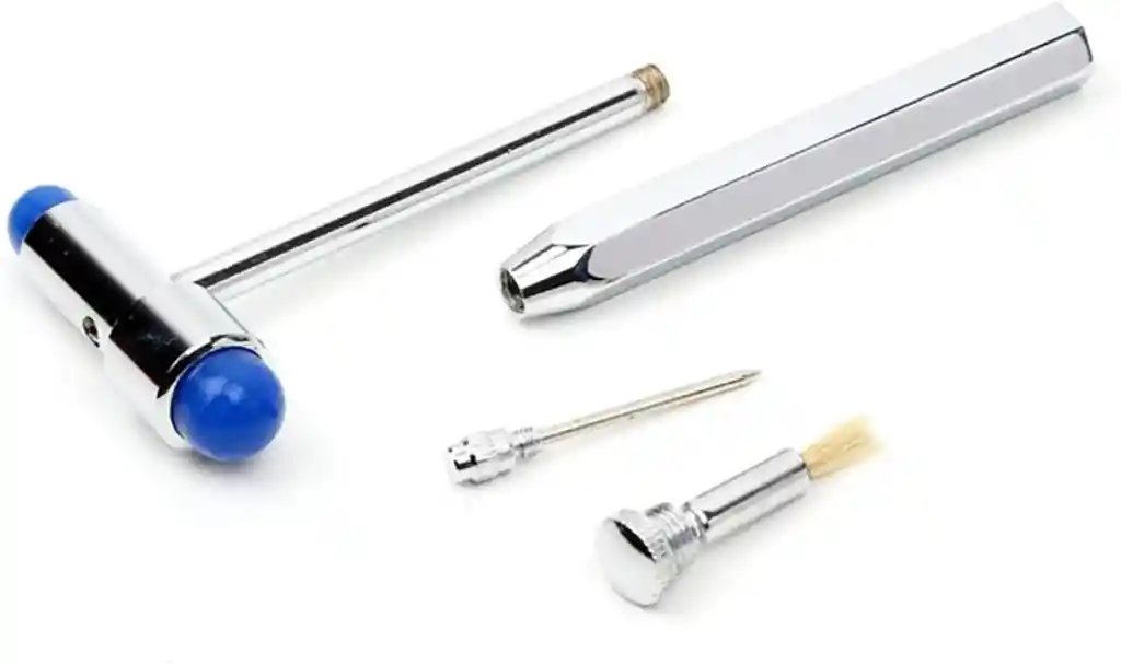 Martillo de reflejos tres servicios o tipo Buck utilizado para la examinación de reflejos y sensibilidad, fabricado en aleación de zinc y cabeza en PVC de doble extremo. Mango ergonómico y removible con punta tipo alfiler y escobetilla. Características: • Largo: 18,8 cm • Ancho: 2,1 cm • Tamaño: 23 cm x 8 cm El martillo de reflejos es un instrumento de gran uso en la práctica médica para evaluar las estructuras neurológicas. En el caso del reflejo patelar y aquiliano el médico observa la amplitud de la respuesta refleja que resulta de golpear el tendón. También es de interés conocer otras características del reflejo tales como la latencia, para lo cual es útil conocer el momento en que se aplica el estímulo.