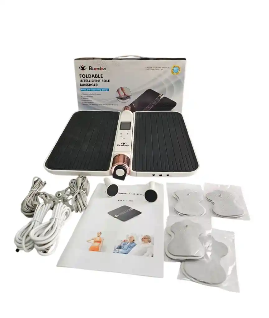 Producto:** Foldable Intelligent Sole Massager (Modelo BLD-331) **Marca:** Blueidea **Descripción:** Este es un masajeador de plantas de pies plegable con un diseño de oscilación hacia adelante y hacia atrás. Utiliza tecnología EMS (Estimulación Muscular Eléctrica) para proporcionar varios beneficios de salud y bienestar. **Características principales:** - **Estimulación muscular electrónica (EMS).** - **Terapia física** para aliviar molestias y mejorar la circulación. - **Función de masaje** relajante para los pies. - **Apoyo en adelgazamiento corporal.** - **Protección de la salud** mediante reflexología de pies, estimulando órganos internos. - **Diseño plegable** y portátil para facilidad de uso y almacenamiento. **Beneficios promocionados:** - Cuidado integral de los pies. - Mejora general de la salud. - Sesiones de uso de hasta 30 minutos. **Otros detalles:** - Pantalla de control digital. - Modos y niveles de intensidad ajustables.