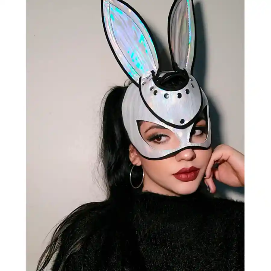 Máscara de coneja para combinar con tu lencería y preparar un show de roles con tu pareja. *Combínala con nuestros accesorios fetiches. Características: Material: cuero sintético Talla única Color: Blanco holográfico