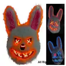 Careta con diseño de conejo maldito Teddy con luz. Material: plastico duro y grueso. La luz viene de diferentes colores. No se puede seleccionar el color. Utiliza 2 pilas AA, no vienen incluidas. Tiene 3 secuencias. Ideales para el carnaval carioca, cumpleaños infantiles, tandas temáticas de Halloween, como accesorio para disfraces y para todo tipo de festejos.