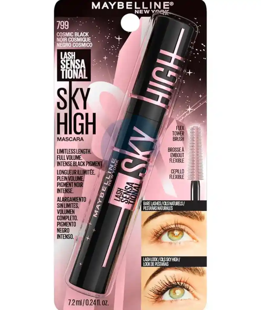 Esta máscara de pestañas está diseñada especialmente para dar máxima longitud y mayor volumen en las pestañas, gracias a que contiene un cepillo personalizado con punta flexible que las va extendiendo una a una, logrando levantarlas al máximo, desde la raíz hasta la punta. Es un cosmético totalmente a prueba de agua, formulado con extracto de bambú y fibras para ayudar a cuidar tus pestañas. Además, no deja grumos, ni manchas, por tanto, no se corre ni se difumina y puede durar hasta 24 horas. Lash Sensational Sky High es apta también para ojos sensibles y usuarios de lentes de contacto.