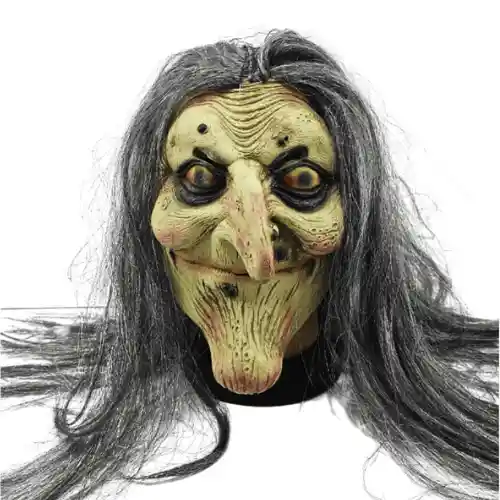 Máscara de látex de bruja con cabello largo, rostro detallado y realista. Ideal para disfraces de Halloween, teatro y eventos temáticos. Cómoda, flexible y de fácil ajuste.