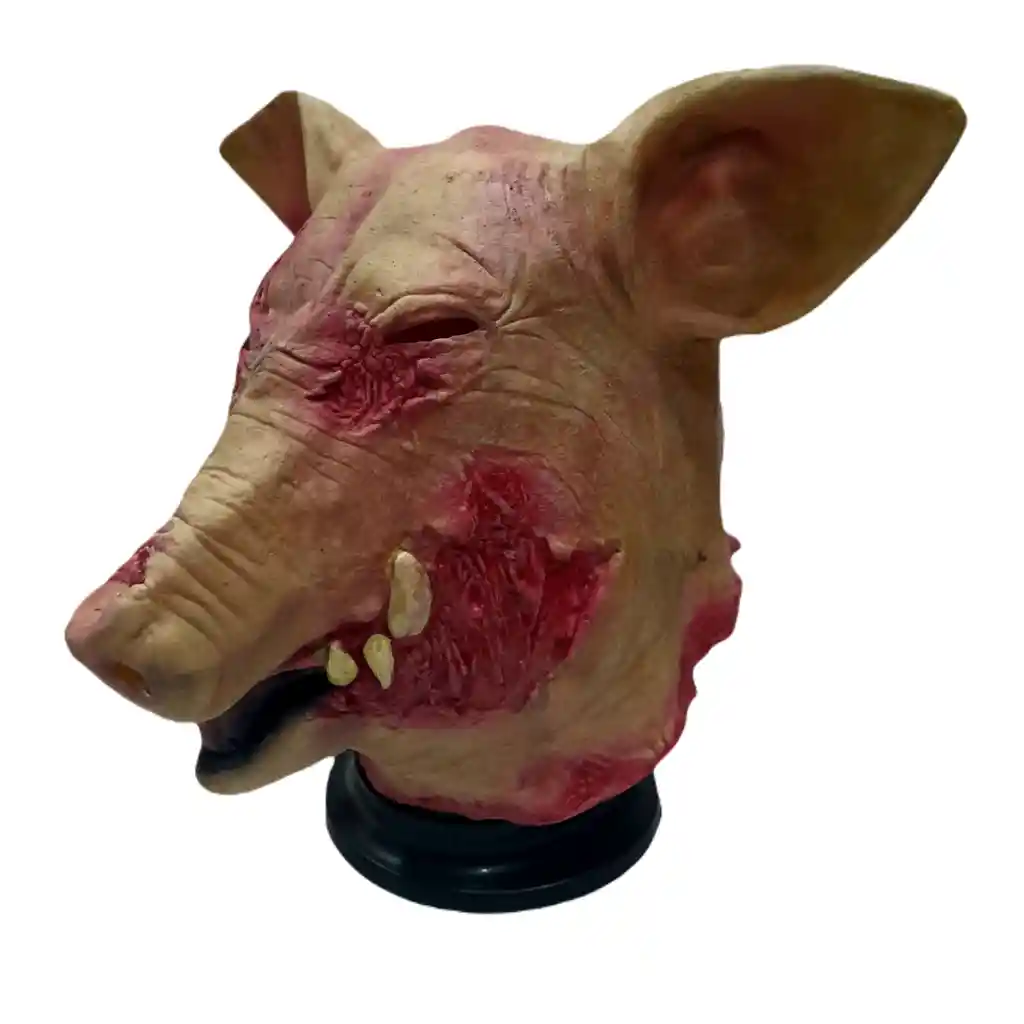 Máscara de látex cerdo asesino con diseño aterrador y detalles realistas. Perfecta para Halloween, disfraces de terror y eventos temáticos. Flexible, cómoda y resistente.