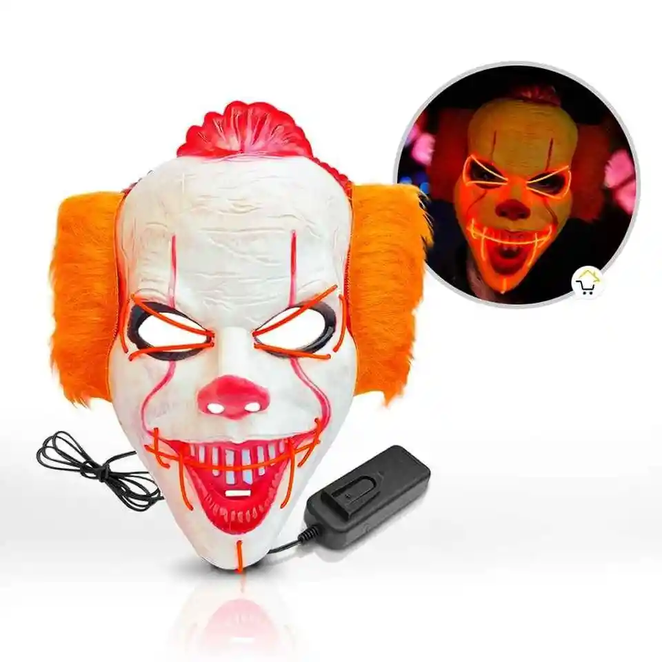 Mascara de IT con luces led en color neón integradas que la hacen una máscara muy llamativa para fiesta de disfraces, Halloween.