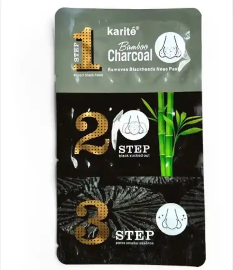 producto es una mascarilla de carbón activado de 3 pasos Karité para la nariz, diseñada para eliminar puntos negros y espinillas. Sus características principales incluyen: Un sistema de tres pasos para una limpieza profunda de los poros. El primer paso suaviza la piel para facilitar la extracción de los puntos negros. El segundo paso utiliza una tira de carbón para extraer físicamente las impurezas. El tercer paso aplica una esencia para ayudar a minimizar la apariencia de los poros