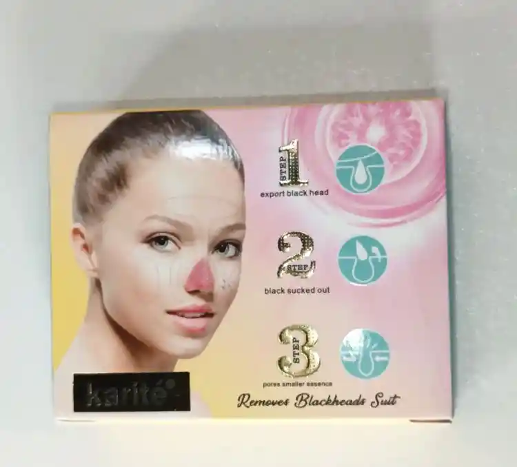 Este es un set removedor de puntos negros de 3 pasos de la marca Karité. Diseñado para liberar, absorber y sellar los poros. Incluye tres pasos: exportación de puntos negros, succión de puntos negros y esencia minimizadora de poros. El producto está diseñado para la limpieza profunda de la piel, especialmente en la zona de la nariz. La marca Karité es conocida por sus productos para el cuidado de la piel.
