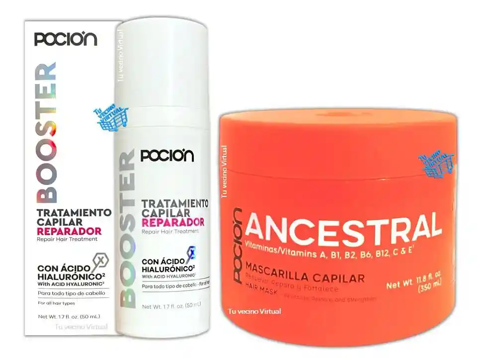 En tu vecino virtual también encontraras : Anyeluz, syam cosmetic, piel de oro, Kaba, class gold, lampiña, Te verde de matcha Benefit, te plus, te latte, te negro, exfoliante, aceite de coco, pomada alfa, colageno hidrolizado,vinipel osmótico, Bioaqua Acne, Mascarillas,tónico, Trendy, la pocion, HGW y muchos mas ————————————————————————————————————————————————— BOOSTER - Tratamiento Capilar Reparador Booster es el tratamiento todo en uno que tu cabello necesita para hidratar, fortalecer y proteger en un solo paso. Su avanzada tecnología de lípidos, combinada con ácido hialurónico, permite que los ingredientes activos penetren profundamente, maximizando la absorción de nutrientes y ofreciendo resultados visibles en solo 2 minutos. Úsalo solo para una hidratación intensa, protección avanzada y control del frizz, o mézclalo con mascarillas, tratamientos y cremas para peinar para potenciar sus beneficios y acelerar sus efectos. Con Booster, tu cabello se verá más brillante, fuerte y saludable en menos tiempo. Modo de uso: lava el cabello con tu shampoo habitual y enjuágalo bien. Mezcla 5 push de Booster con tu producto preferido en la palama de la mano y aplícalo sobre el cabello húmedo. Deja actuar 2 minutos, enjuaga y peina como de costumbre. También puedes usar nuestro Booster sin mezclar, aplicando 5 push directamente sobre el cabello húmedo o seco y opta por dejarlo o enjuágalo según tu preferencia. Contenido: 50 mL ——————————————————————————— Mascarilla Ancestral la poción ANCESTRAL con alto poder reestructurante, hará que cada fibra rota de tu cabello se una nuevamente, mejorando visiblemente su apariencia, ayudará a prevenir el daño futuro, formando un escudo protector en cada hebra, incrementará la fuerza, promoverá el crecimiento y disminuirá la caida. Mascarilla ANCESTRAL fue creada para cabellos sobreprocesados de todas las texturas y para los que deseen mejorar y llevar sus hebras a otro nivel de belleza y salud. Contiene: 350 mL Invima :NSOC09996-21CO