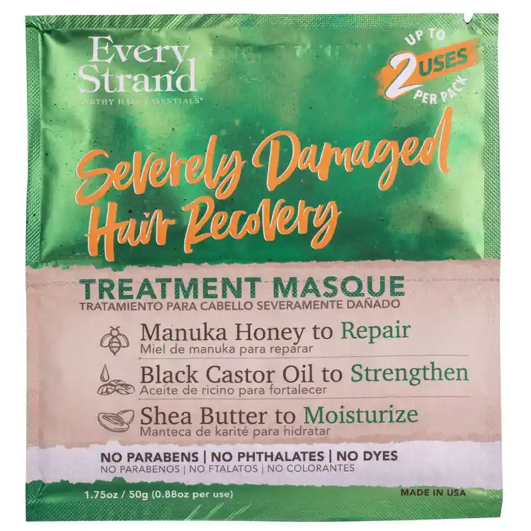 Mascarilla de tratamiento para la recuperación del cabello severamente dañado. Repare el daño y restablezca la suavidad con la mascarilla de tratamiento con infusión emoliente de Every Strand. Seguro de usar en todo tipo de cabello. • Miel de manuka para reparar. • Aceite de ricino negro para fortalecer. • Manteca de karité para hidratar. CÓMO UTILIZARLO: Después del champú, aplicar una pequeña cantidad sobre el cabello húmedo desde la raíz hasta las puntas. Dejar en 5-7 minutos. Enjuague bien. Úselo según sea necesario para una hidratación intensa y manejabilidad. Tratamiento en sobre, contenido: 50g.
