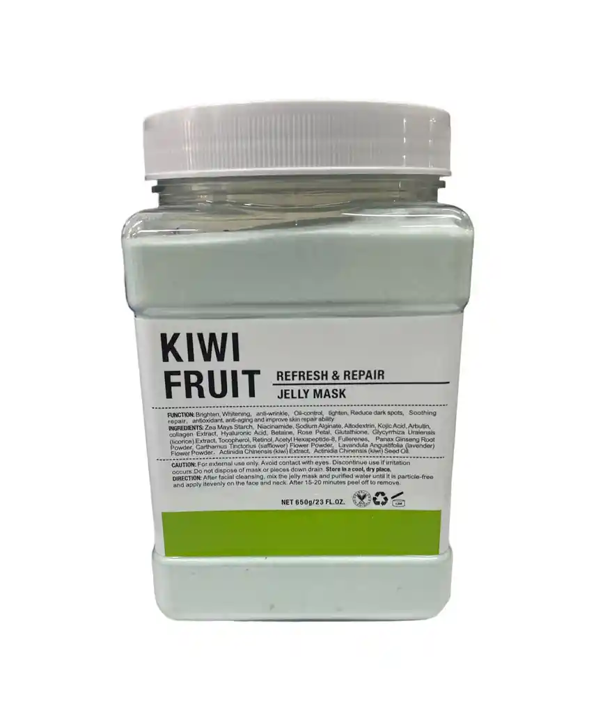 Mascarilla hidroplasticas Kiwi fruit FUNCIÓN: iluminar, blanquear, antiarrugas, controlar el aceite, apretar, reducir las manchas oscuras, reparar calmante, antioxidante, antienvejecimiento y mejorar la capacidad de reparación de la piel INGREDIENTES: almidón de Zea Mays, niacinamida, alginato de sodio, altodextrina, ácido kójico, arbutina, extracto de colágeno, ácido hialurónico, betaína, pétalo de rosa, glutatión, extracto de glicirriza uralensis (regaliz), tocoferol, retinol, acetil hexapéptido-8, fullerenos, Panax Polvo de raíz de ginseng, Polvo de flor de Carthamus Tinctorius (cártamo), Lavandula angustifolia (lavanda) Polvo de flores. Extracto de Actinidia chinensis (kiwi), aceite de semilla de Actinidia chinensis (kiwi)