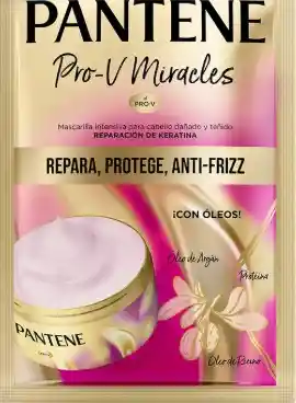 mascarilla multi-beneficios Repara, Protege, Anti/Frizz de la línea Pantene Pro-V Miracles con óleos naturales. Su tecnología inteligente identifica las áreas dañadas del cabello y ayuda a repararlo donde más lo necesita, proporcionando hidratación y nutrición al cabello logrando una gran suavidad y protección del color de tu cabello. Su fórmula con óleo de argán, óleo de ricino, proteína y Pro-Vitaminas, está diseñada para cabellos dañados y teñidos, dándole un shot de reparación intensa.