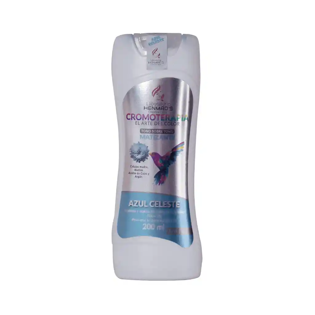 TRATAMIENTO MATIZANTE AZUL CELESTE TONO SOBRE TONO ESTE PRODUCTO ES UNA MASCARILLA MATIZANTE (TONO SOBRE TONO) IDEAL PARA MANTENER EL COLOR DEL CABELLO TINTURADO, NEUTRALIZAR TONOS O DAR COLOR A MEDIDA QUE SE VA APLICANDO EN CABELLOS ALTAMENTE DECOLORADOS (SIN RASTROS AMARILLOS, NARANJAS O CAFES). CONTIENE: 200ML CARACTERISTICAS: - Hidrata y matiza los tonos envejecidos. - Filtro UV. - Previene la caída del cabello. - Anti Frizz. DESCRIPCIÓN: Su formula proporciona hidratación profunda del cabello, además, nutre el cuero cabelludo para darle mayor vitalidad a las fibras capilares y prevenir su caída. INSTRUCCIONES DE USO: Aplique uniformemente permitiendo que el producto cubra toda la superficie del cabello. Con un peine distribuya bien el producto y deje actuar de 15 a 20 min. Enjuague. CONTIENE: Células Madre: Regenerador, restaura la hebra capilar, antienvejecimiento, fortalece el folículo piloso. Biotina: Detiene la caída del cabello y acelera su crecimiento, aporta elasticidad. Aceite de coco: Fortalece la raíz, protección de los rayos UV, antioxidante, disminuye la descamación. Aceite de argán: Hidrata el cuero cabelludo aportándole brillo y sedosidad, restaura las puntas abiertas, elimina friz, anti polución, desenreda la fibra capilar.