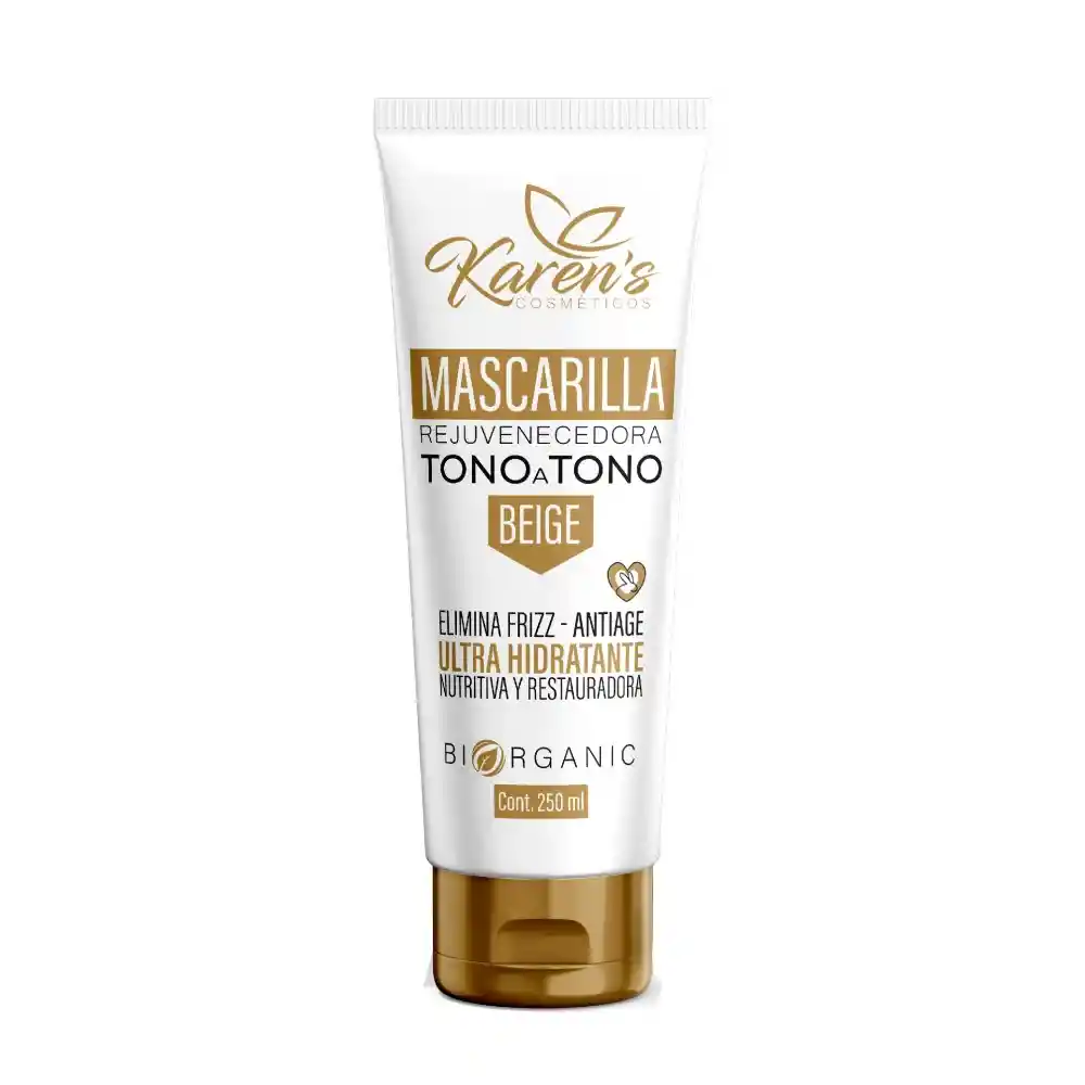 Mascarilla Matizante Rejuvenecedora Tono sobre Tono BEIGE PRODUCTO VEGANO Contiene: 250ml Bondades: ELIMINA FRIZZ – ANTIAGE ULTRA HIDRATANTE NUTRITIVA Y RESTAURADORA 100% NATURAL – VEGANO La MASCARILLA REJUVENECEDORA TONO A TONO contiene una concentración excepcional de nutrientes en su composición, tales como proteínas, aminoácidos y vitaminas que restauran el cabello, brindándole beneficios como elasticidad, equilibrio y fuerza, que le dan una mejor textura y sedosidad. Todos estos nutrientes le dan vida y salud al cabello, mejoran su peinabilidad, aportan sedosidad, elasticidad y más brillo. Bondades: - Alto Brillo - Reparación Intensa - Sedosidad Extrema - Peinabilidad - Nutrición Profunda - Vitalidad.
